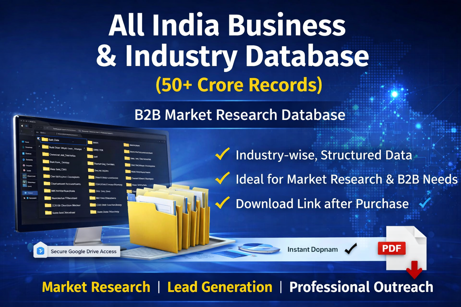 The All India Business & Industry Database (50+ Crore Records) is a professionally organized B2B market research directory that covers multiple industries, professions, and business sectors across India.